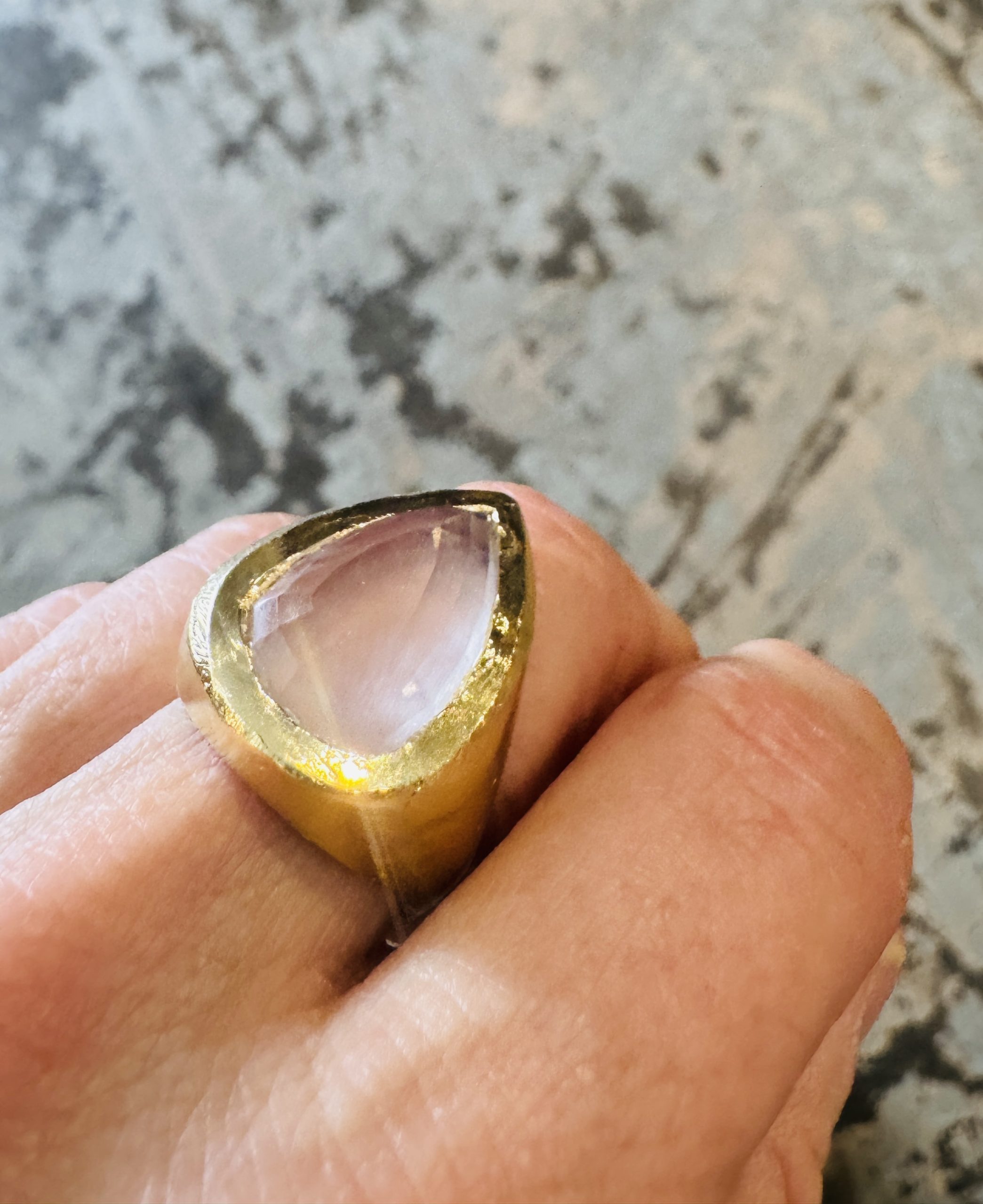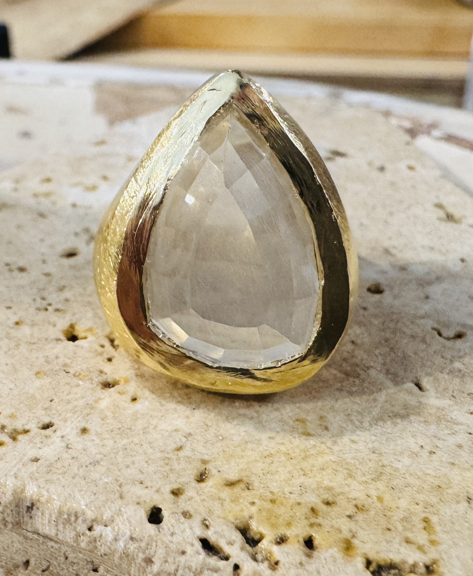 Beautiful briolette faceted moonstone ring, set with an open back so your ring looks unique on you.