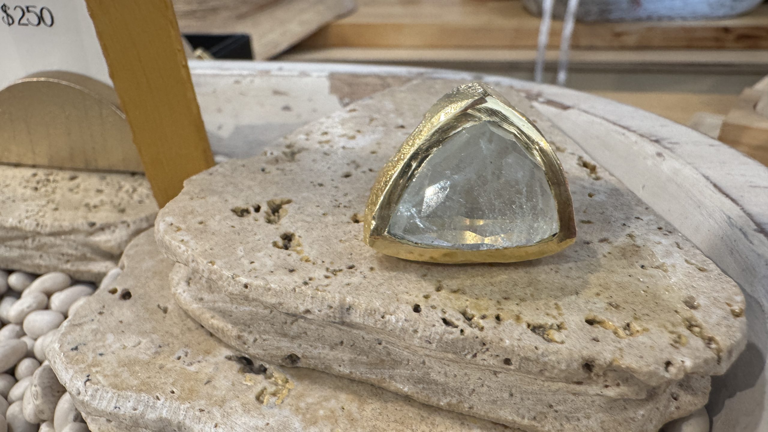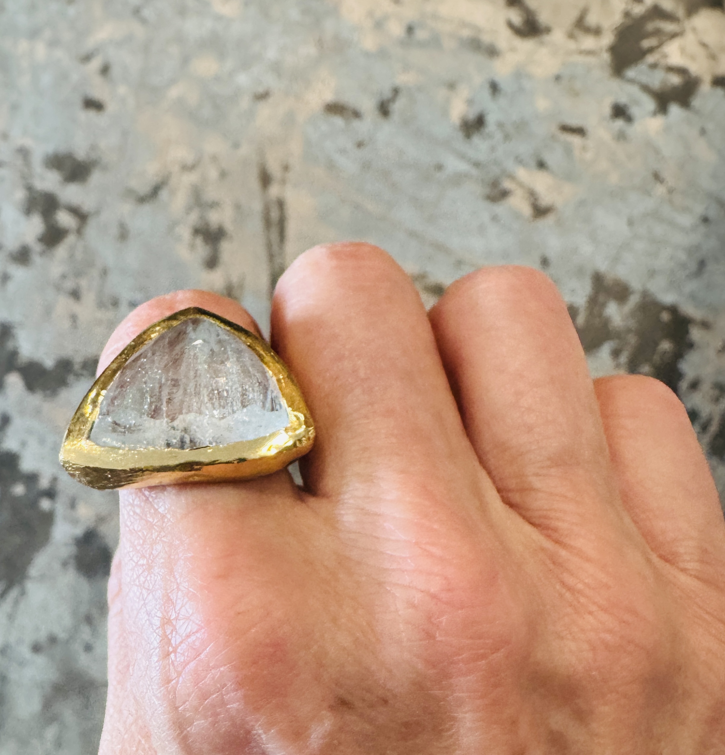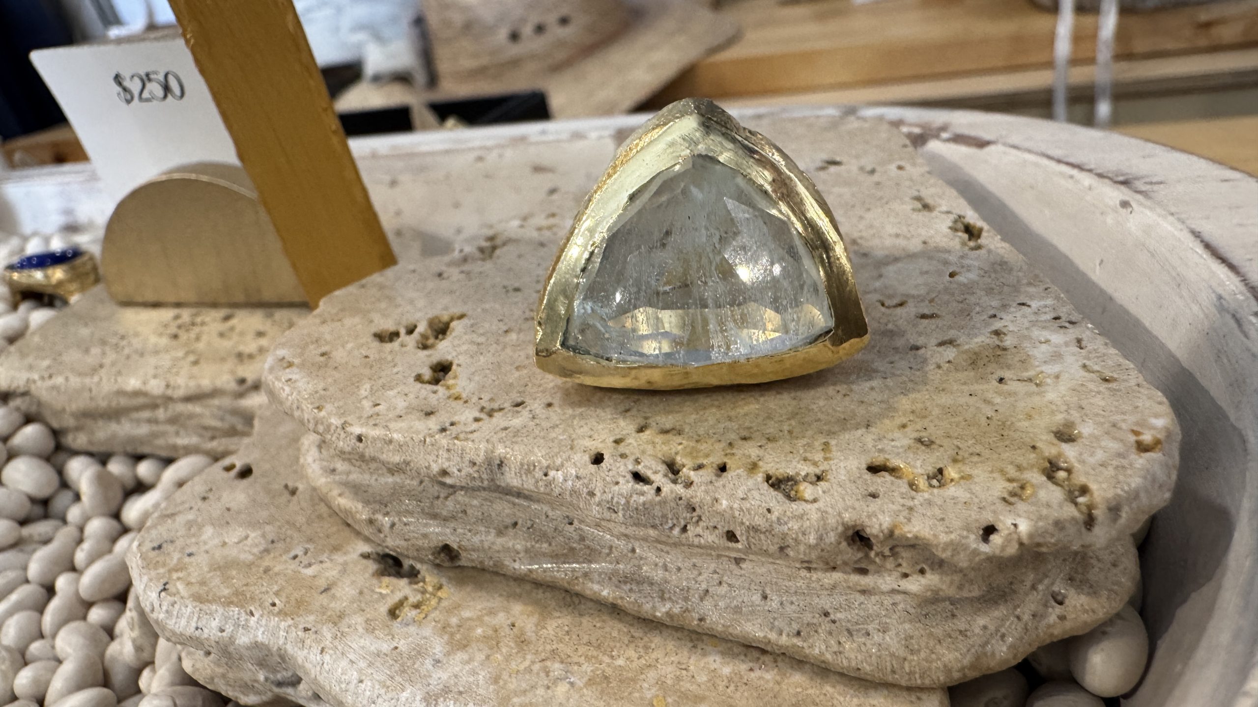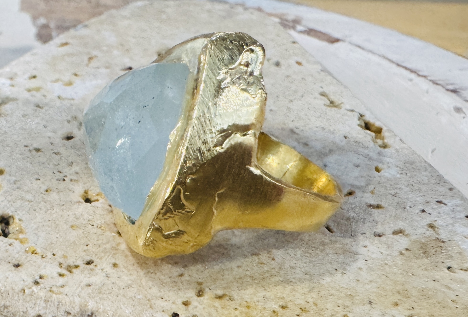 A Stone of Courage; March’s birthstone carries into personal development, as well. Crystal experts believe the stone of the sea enables us to access our deep inner wisdom. This, in turn, empowers us to remain true to our deepest values, expressing our feelings openly and communicating with others from the heart. In addition to the symbolism and meaning attributed to it, aquamarine is absolutely gorgeous. This ring is hand-sculpted in recycled sterling with gold vermeil added.